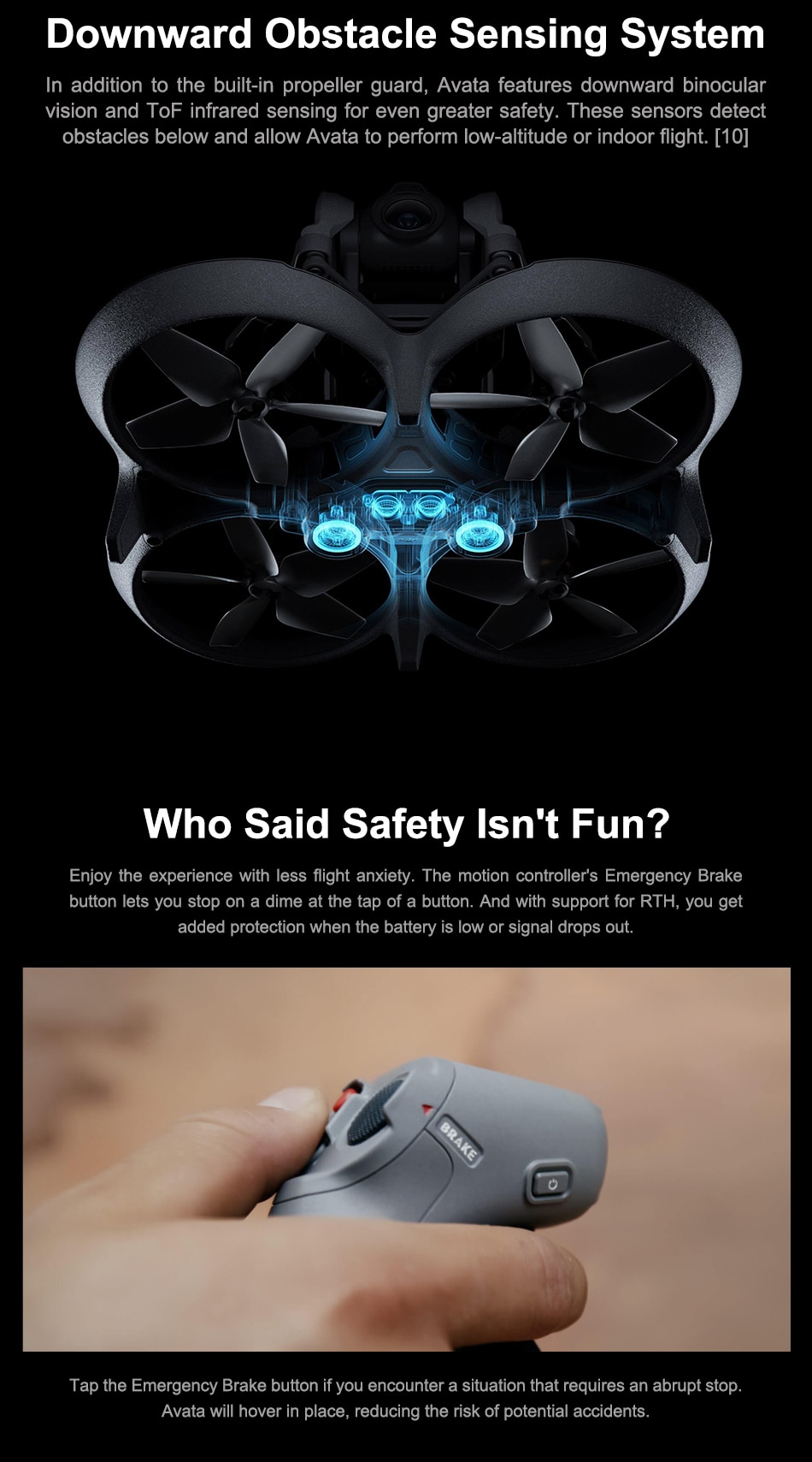 2. DJI Avata is equipped with downward obstacle sensing capability. In case of an emergency during flight, you only need to press the Emergency Brake and Hover button on the DJI Motion Controller, and the aircraft can hover in the air to leave plenty of buffer space for you.