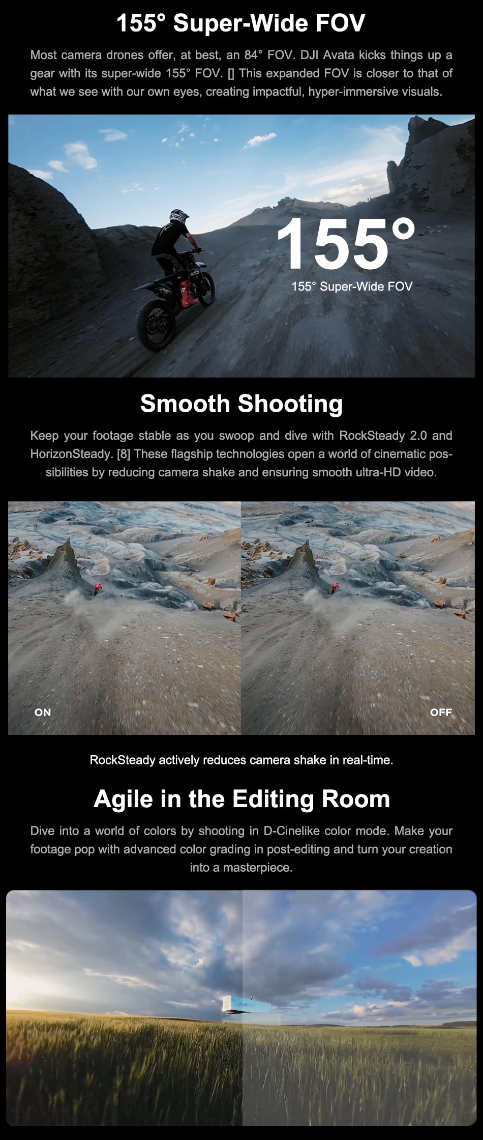 3. Compared with the 84° FOV of ordinary camera drones, the video recording FOV of DJI Avata has been expanded to 155°. This expanded FOV makes a breakthrough in aerial photography and facilitates more impactful visual effects.